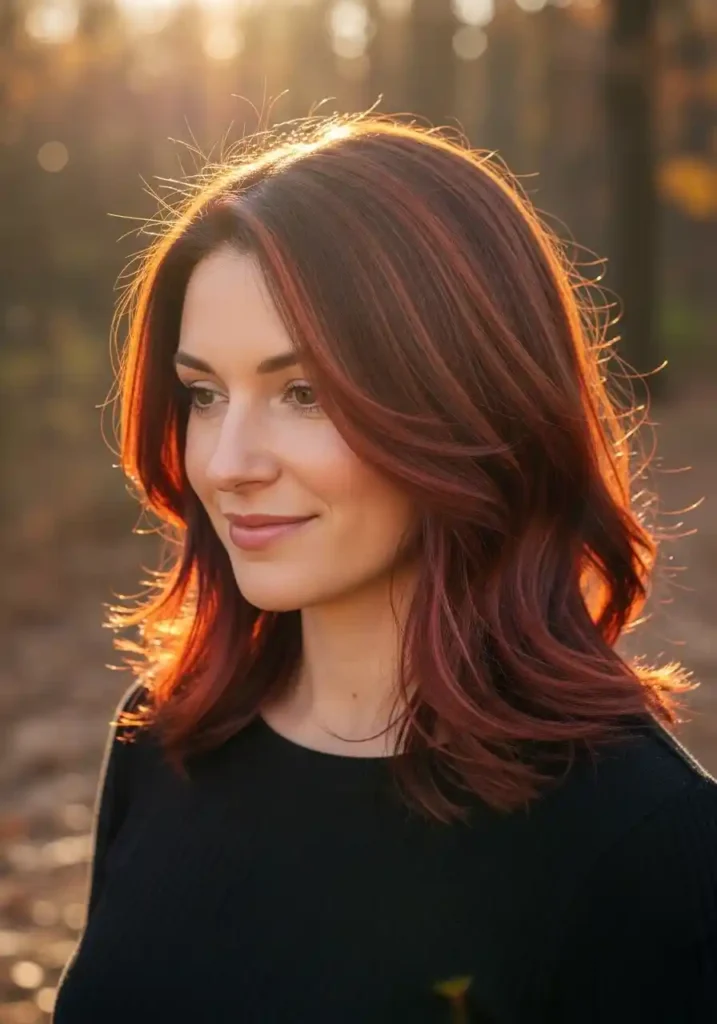 Auburn with vivid red undertones is the most fiery and energetically vibrant interpretation within the auburn family, pushing the color toward the red end of the red-brown spectrum in a way that creates a shade that is unmistakably bold and vivid while retaining enough brown to maintain the grounding depth and warmth of true auburn rather than crossing fully into the territory of a straightforward red hair color. This is the auburn for women who want their color to communicate genuine vitality and warmth with complete confidence, creating hair that catches sunlight with an almost incandescent quality and generates immediate, admiring attention from everyone who encounters it in any lighting condition.