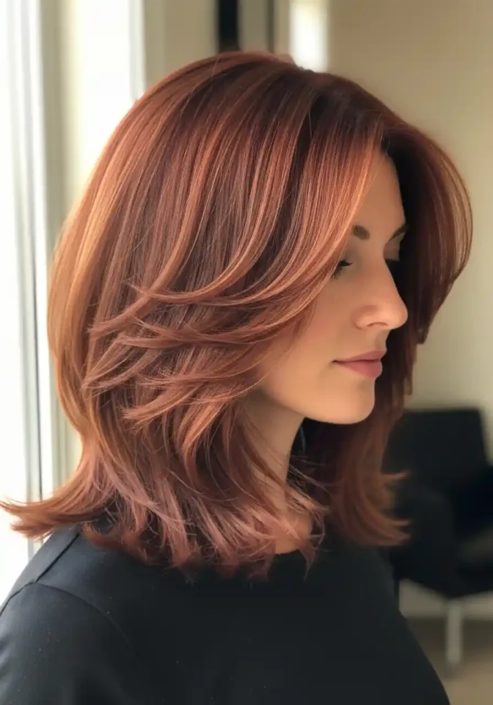 The combination of auburn and copper tones creates a color that performs most spectacularly in natural and warm artificial light where both tones are activated simultaneously, creating a hair color that appears to produce its own warm light source from within the strands rather than simply reflecting external illumination. Women who wear this combination consistently describe moments in outdoor sunlight as genuinely extraordinary, with their hair blazing with such warm, vivid color that people around them stop to comment on its beauty. The copper tones also help extend the perceived vibrancy of the auburn between color appointments by providing additional warm pigment that continues to glow beautifully as both colors fade at their natural rate.
