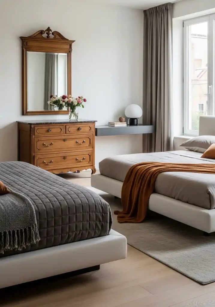 A bedroom that balances genuine antique furniture with contemporary architectural elements and modern textiles creates an interior of extraordinary depth and genuine personal character that neither a purely contemporary nor a purely period bedroom can achieve independently. The antique pieces bring the specific warmth of history and craftsmanship — the aged walnut of a genuine eighteenth-century dresser, the hand-carved detail of an inherited mirror frame, the specific proportions of furniture made before industrial manufacturing standardized everything — while the contemporary elements provide the clean visual clarity and functional intelligence that modern life requires.
