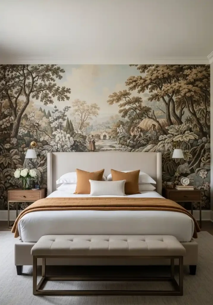 A floor-to-ceiling treatment of the entire wall behind the bed — treating it as one continuous surface of dramatic visual impact from floor to ceiling rather than as a wall with a headboard hanging at bed height — creates a bedroom of genuine theater and visual ambition that conventional headboard-and-wall-above arrangements cannot achieve. Whether the treatment is a large-scale botanical wallpaper that extends to the ceiling, a hand-painted mural that fills the full wall height, a dramatic material like handmade zellige tile, or a bold paint color that saturates the entire wall surface, the floor-to-ceiling approach makes the bed wall the most powerful visual statement in the room.