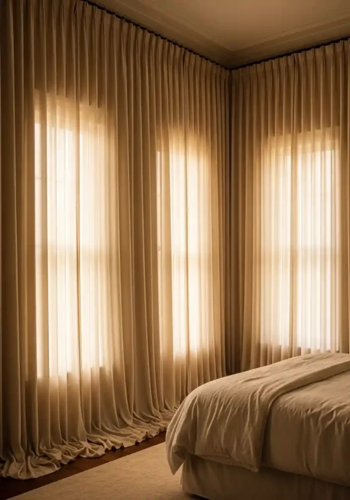 Floor-to-ceiling curtains hung from ceiling-height rails and falling in generous sweeps to the floor — ideally pooling slightly at the base — create a bedroom of extraordinary softness, acoustic warmth, and visual elegance that is immediately and unmistakably luxurious. The ceiling-height hanging is the detail that transforms curtains from a window treatment into an architectural feature — by running the curtain rail as close to the ceiling as possible and allowing the fabric to fall in an uninterrupted sweep from ceiling to floor, the room’s apparent ceiling height increases significantly and the windows appear dramatically taller and more generous than they actually are.