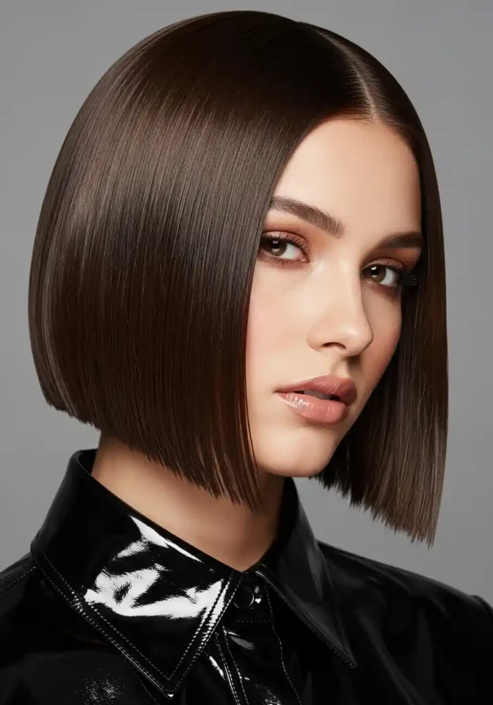 A rich brown bob with a glass finish is arguably the most striking expression of glossy brown hair available — because the bob’s compact, geometric shape concentrates all of the color’s luminosity into a controlled, precise silhouette where the gloss finish has maximum visual impact. Where long hair distributes the glossy surface across a flowing, curved expanse, the bob presents it in a clean, hard-edged geometric form that reads as deliberately, architecturally beautiful. The glass-finish gloss on a rich brown bob creates a result that looks almost architectural in its precision and almost unreal in its luminosity.