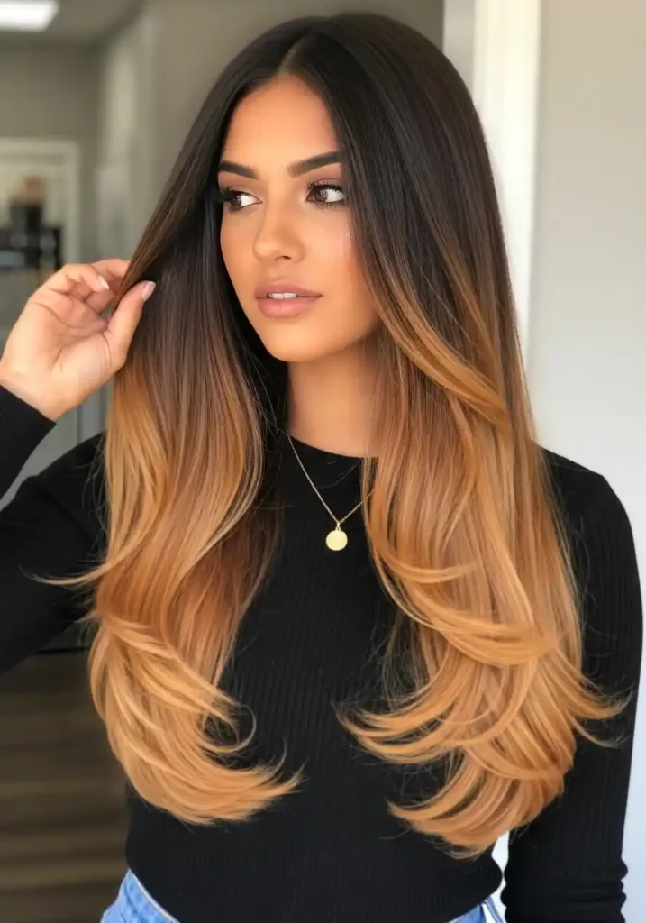 A rich brown ombre with a glossy gradient is one of the most dimensionally sophisticated color approaches available in the brown family — it uses the natural principle of hair being darker at the root and lighter at the ends, amplifies it into a deliberately beautiful and precisely calibrated color journey, and then finishes the entire gradient with a gloss treatment that creates one unified, luminous surface from the deepest root tone to the lightest end tone. The result is a single, cohesive color composition with extraordinary depth at the crown and warm luminosity at the ends.