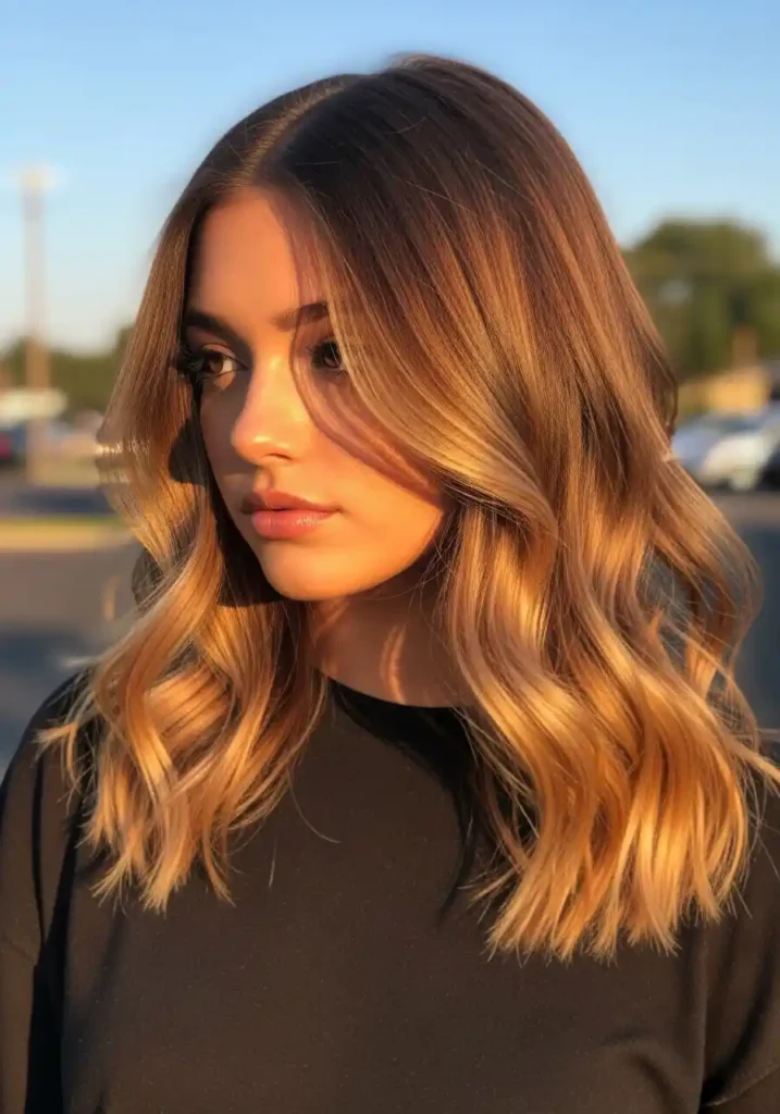 The ribbon quality of the caramel placement — the hand-painted pieces flowing through the hair in long, continuous sweeps rather than uniform, evenly spaced blocks — is what distinguishes this color from conventional highlights and gives it its particularly natural, organic character. Each caramel ribbon follows the direction of the hair’s natural movement, appearing in the places where light would most logically and most naturally fall, creating a result that rewards examination with the observation that no two ribbons are placed identically. The glossy finish that ties this color together is essential — a warm-toned gloss applied over the completed balayage deepens the base, warms the caramel pieces, and creates a unified luminous surface across the entire composition.