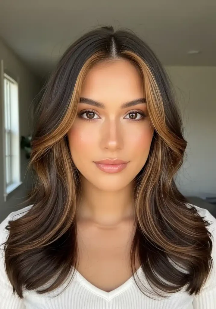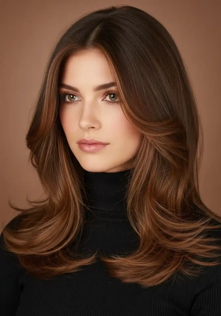The specific tone of the face-framing pieces within a rich brown context is crucial to the naturalness and flattery of the result — the pieces should be lifted to a warm medium brown that is two to three levels lighter than the base, toned to a warm, slightly golden brown rather than a cool ash brown. Cool face-framing pieces in warm brown hair create a tonal clash that undermines the color’s natural warmth and can read as an error rather than an intentional design decision. Warm-toned lighter pieces in the same color family as the base create a seamless, organic brightening that reads as genuinely beautiful and genuinely natural.