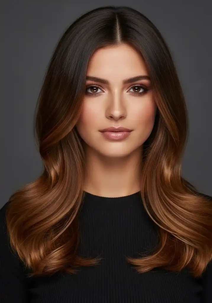 The glossy finish over a brown ombre requires a different approach than glossing a single-tone color — the gloss formula must be calibrated to enhance every stage of the gradient without pushing any single section too far in either the warm or cool direction. A professional colorist typically applies a warm-toned clear gloss or a very slightly tinted warm gloss over the entire result after the ombre is completed, creating a unified tonal warmth that makes the gradient read as a cohesive color story rather than multiple separate colors existing in the same head of hair. The gloss also fills the cuticle across every section of the ombre simultaneously, creating the continuous glossy surface that makes the gradient most beautiful.