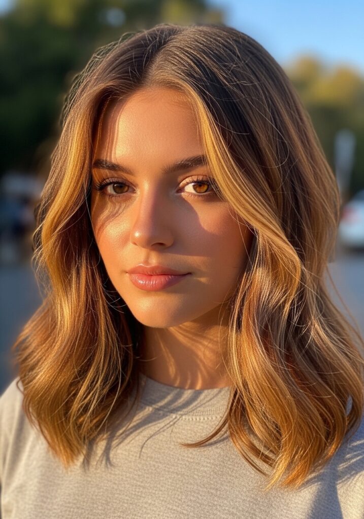 The specific warmth of the face-framing sections should be calibrated to complement the soft brown base and the client’s complexion simultaneously — warm honey tones create the most universally flattering face-framing for warm or neutral complexions, while a slightly softer, more muted warm sandy tone creates the most natural-looking face frame for cooler complexions. A warm unifying gloss over the completed face frame and base ensures the two elements appear as one cohesive, naturally warm color story rather than as obviously placed highlights within a separate base color.