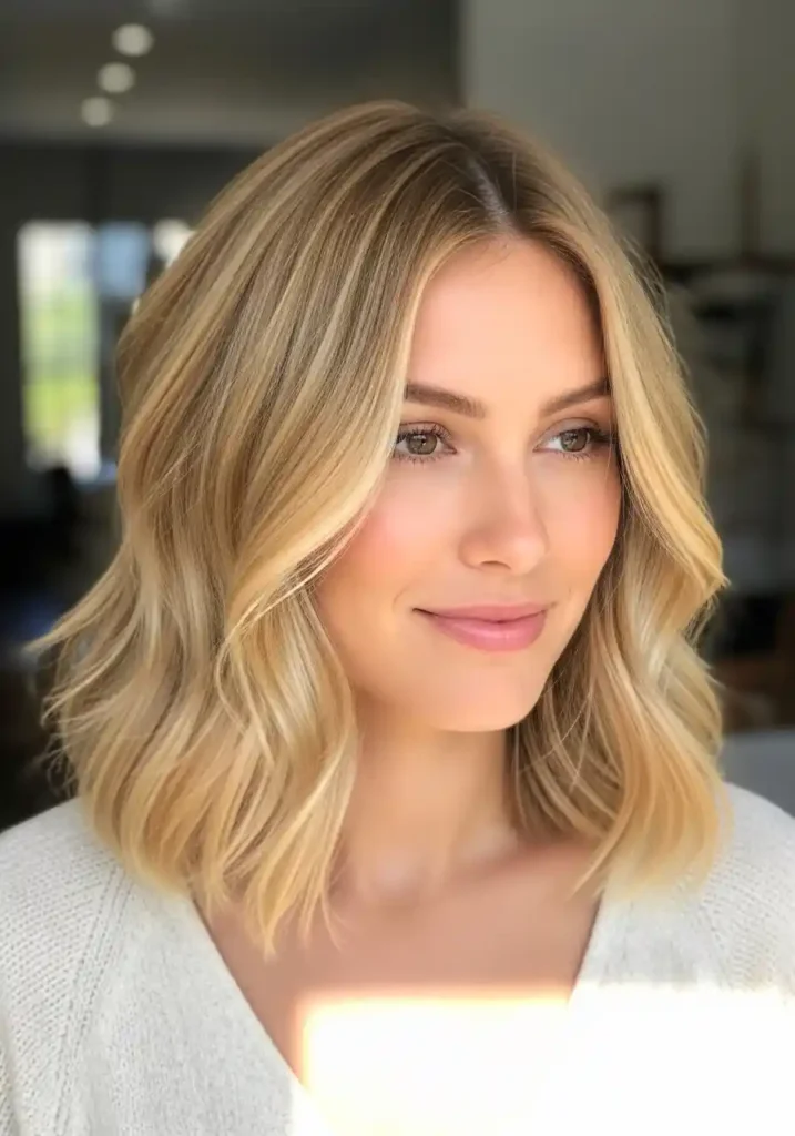 Butter blonde color on a lob haircut creates a pairing of such natural aesthetic harmony that each element makes the other more beautiful in the context of the combination, with the warm, creamy color adding richness and luminosity to the clean structure of the lob while the lob’s shoulder-length proportions provide a canvas of exactly the right size to display the warm, creamy butter tones with maximum elegance and minimum distraction from either excessive length or extreme brevity. The lob length allows the full tonal richness of butter blonde to be visible across the complete length of the cut.