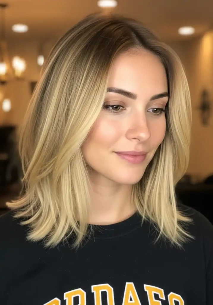 The specific way butter blonde behaves on a lob depends significantly on the styling choice, with a sleek, smooth blowout revealing the clean warmth and creaminess of the butter tones with maximum surface shine while loose waves scatter the warm light across the dimensional color in a way that creates a more organic, sun-kissed impression. Both styling approaches showcase the fundamental beauty of butter blonde on a lob, with the shorter length concentrating the warm tones in a way that creates a consistent, unified impression of creamy golden warmth rather than the more graduated quality of butter tones on longer hair. A warm glossing treatment monthly maintains the creaminess.