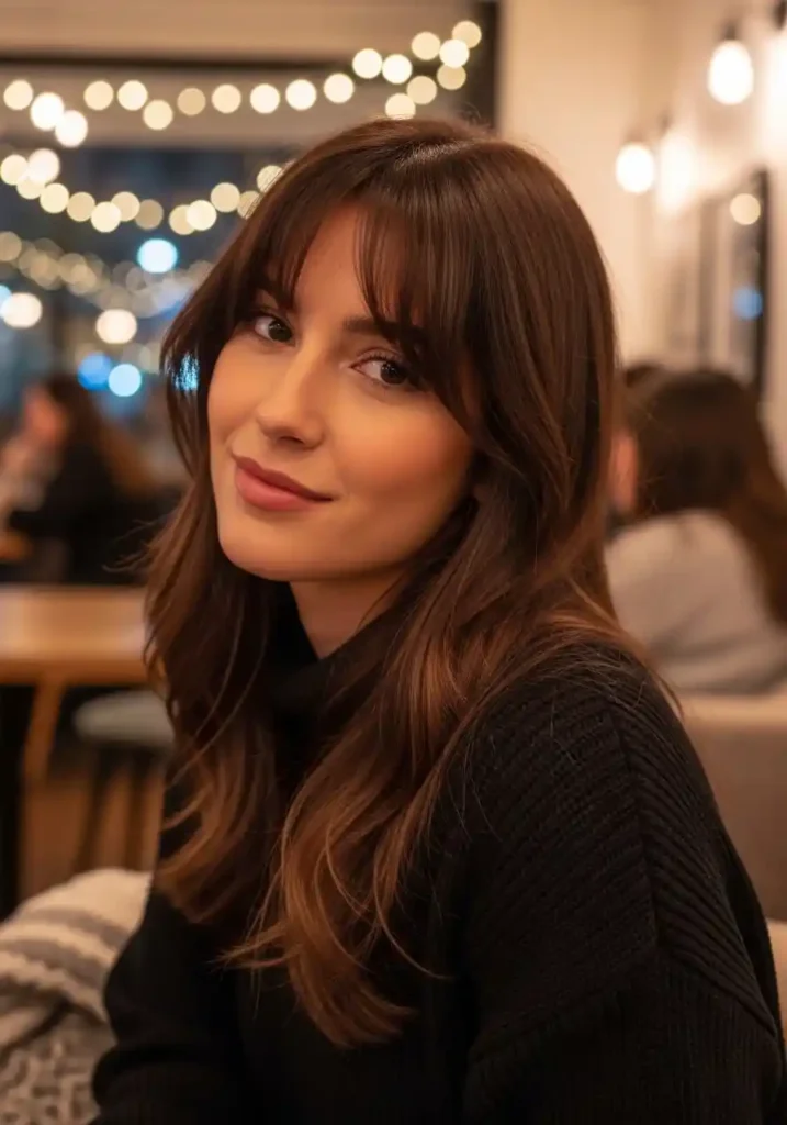 The chocolate brown color specifically enhances the curtain bang effect because the warmth of the cocoa tones creates a subtle depth and shadow at the forehead that makes the bangs appear more dimensional and interesting than they would in a cooler, flatter color. As the bangs sweep away from the center part toward the temples, the chocolate brown catches the light progressively differently along each swept section, creating a gentle tonal variation within the bangs themselves that adds a beautiful, almost dimensional quality to the face-framing effect. Styling requires minimal effort, making this combination one of the most rewarding and accessible high-impact looks in the entire brunette hair repertoire.