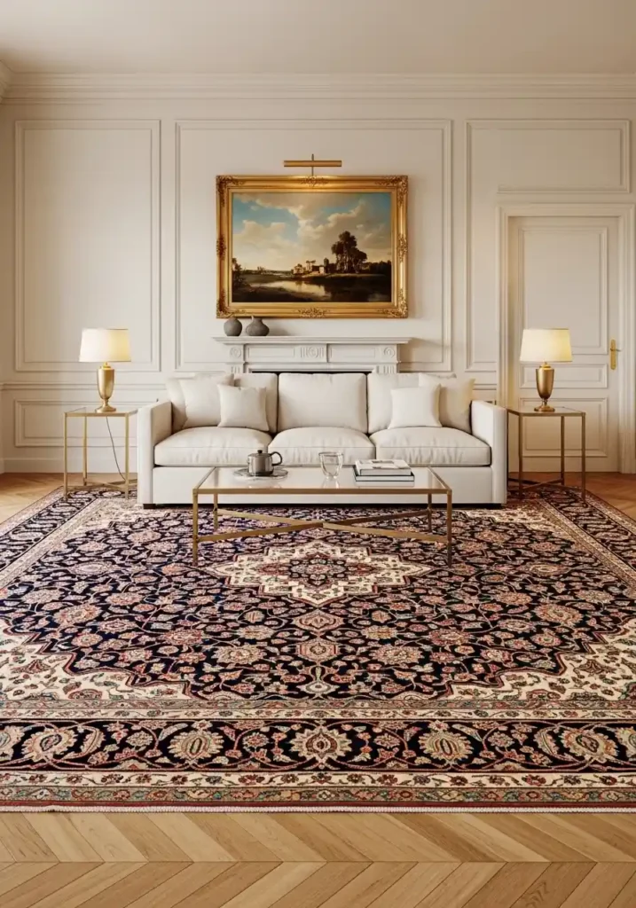 13. The Antique Persian Carpet Living Room: When the Floor Tells the Room’s Most Beautiful Story