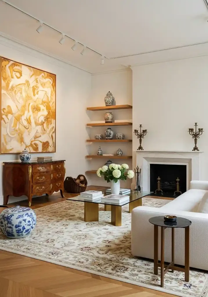The most magnificently sophisticated antique and contemporary living rooms are those where every pairing is genuinely deliberate and genuinely confident — a genuine eighteenth-century French commode immediately beside a significant contemporary abstract painting. Antique bronze doré candelabras flanking a contemporary minimal marble fireplace. A contemporary cashmere sofa positioned on a genuine Aubusson carpet. A contemporary brass and glass coffee table. Antique Chinese porcelain on contemporary floating oak shelving. Warm directional gallery lighting. Warm herringbone parquet. Each confident pairing creates extraordinary timeless elegant sophistication.