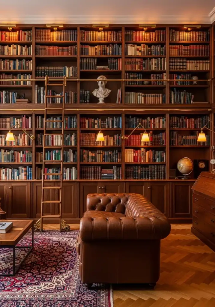 The most magnificently beautiful bespoke library living rooms are those where the books are genuinely real and genuinely read — books with cracked spines, inscribed dedications, and the specific character of genuine reading use creating a library of authentic personal warmth! A polished brass library ladder creating the most theatrical and the most practically beautiful access element. Warm amber library sconces. A large tufted cognac leather Chesterfield. Antique Persian carpet. Warm incandescent lighting. A significant bust sculpture. A vintage globe. Each genuine element creates extraordinary intellectual timeless elegance of complete personal magnificence.