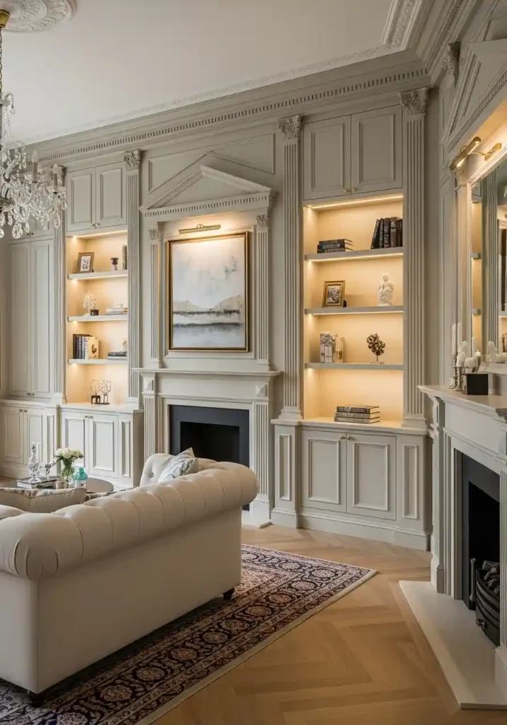 The most magnificently beautiful bespoke millwork classy living rooms are those where every architectural detail of the millwork is executed with the most rigorous traditional craft standards — classical pilaster profiles precisely scaled to the room’s proportions. Panel molding with correct classical relationships. A pediment detail above the central section. Integrated warm LED shelf lighting. Matching custom millwork fireplace surround with classical entablature. Brushed gold hardware throughout. A large cream upholstered sofa. Antique Persian carpet. Warm herringbone parquet. Crystal chandelier. The bespoke millwork creates extraordinary architectural timeless elegance.
