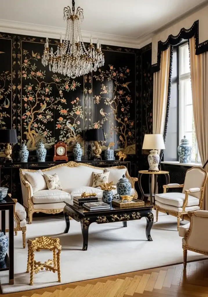 15. The Black Lacquer and Chinoiserie Living Room: Eastern-Inspired Opulence at Its Most Elegant