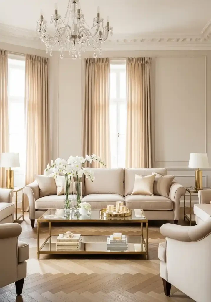 The extraordinary success of a champagne and ivory classy living room depends entirely on the genuine quality and the genuine textural variety of every specific material selected within the restricted palette — because without color contrast to create visual interest, every subtle variation in warmth and every difference in surface quality between velvet and silk and cashmere must carry the complete visual weight of the composition’s richness and appeal! Champagne velvet sofa. Silk scatter cushions in warm ivory and pale gold. Polished brass and glass coffee table. Ivory silk curtains from ceiling height. Crystal chandelier. Fresh white orchids. Warm brass lamps. Each material creates extraordinary layered quiet luxury.