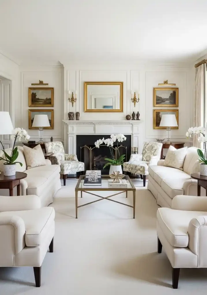 The most magnificently beautiful formally symmetrical classy living rooms are those where the symmetry is completely genuine and completely precise — two matching sofas equidistant from the central fireplace. Two matching bergère armchairs. Two matching crystal table lamps at precisely matching heights. Two matching white orchids in matching crystal vases. Two matching gilt-framed artworks flanking the fireplace. Two matching brass wall sconces at matching heights. Each precisely mirrored element on both sides of the central axis. The comprehensive bilateral symmetry creates extraordinary formal classical living room authority and complete compositional timeless elegance.