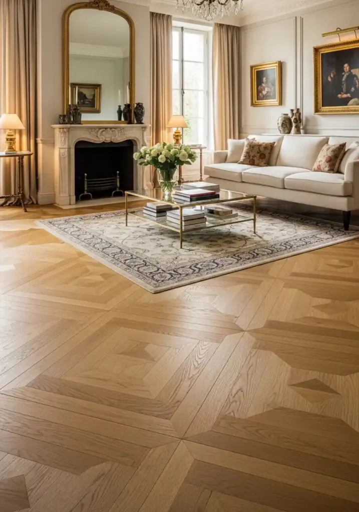 The most magnificently beautiful herringbone parquet classy living rooms are those where the herringbone is used with complete architectural confidence — a large cream sofa floating above the herringbone on a fine antique silk rug. A glass and brass coffee table allowing the floor pattern visible beneath. Floor-to-ceiling cream curtains. A carved marble fireplace. Warm brass table lamps. Significant gilt-framed artworks. Warm afternoon light making the herringbone glow with extraordinary golden warmth. Each element respecting the floor’s supreme architectural authority creates a living room of absolute timeless elegance.