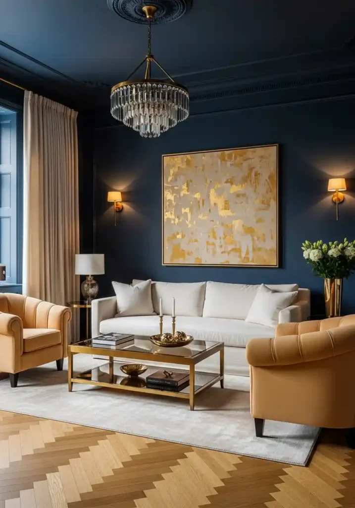 Navy walls with warm polished brass fixtures and accessories create the single most classically sophisticated and the most genuinely timeless color and metal combination available in any classy living room — the deep, warm darkness of midnight navy creating an atmospheric richness of extraordinary elegance while the warm, mirror-bright luminosity of polished brass provides the most warmly complementary and the most historically authentic metallic accent, creating a living room of such complete classical sophistication and such genuine formal authority that every gathering within it feels more beautiful, more significant, and more genuinely elegant than the same gathering in any lighter, less formally committed interior!