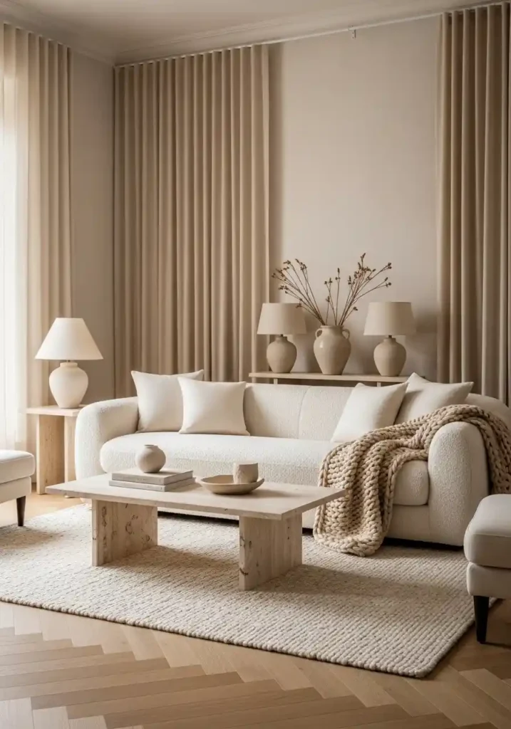 The most magnificently beautiful neutral texture classy living rooms are those where every material is of genuinely excellent quality — bouclé of the finest looped pile. Silk scatter cushions of excellent weave. A genuine cashmere throw of real fiber quality. Travertine coffee table with beautiful natural fossil inclusions. Natural wool area rug. Handmade ceramic lamps from a genuinely skilled potter. Ceiling-height warm ivory linen curtains. Ivory plaster walls with subtle natural texture. A significant ceramic floor vase. Each genuinely excellent material creates extraordinary layered textural richness within the most beautiful, sophisticated neutral timeless palette.