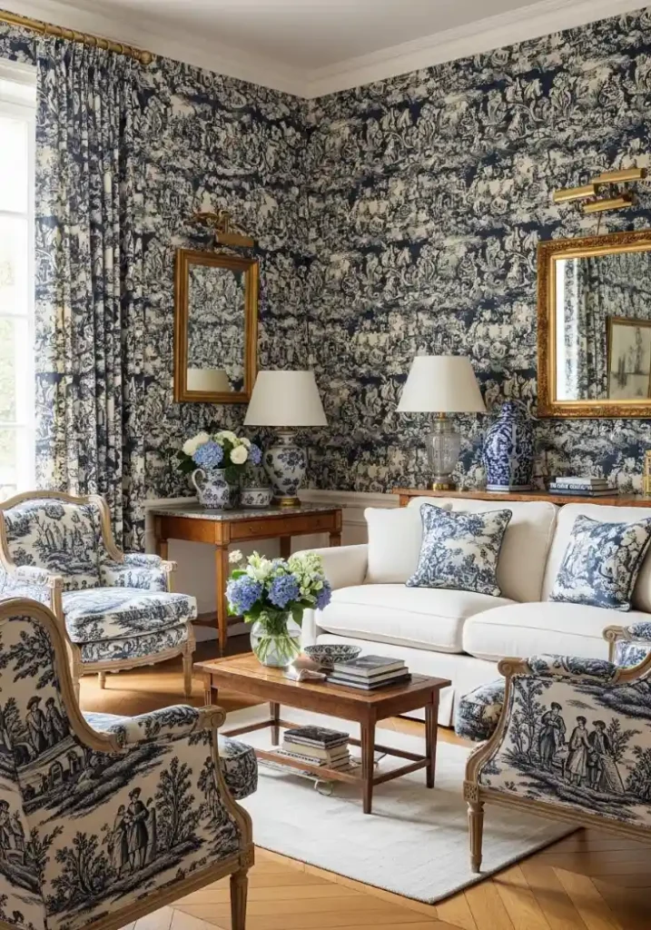 Toile de Jouy in a classy living room — where the traditional French pastoral narrative pattern in deep navy and cream covers walls and selected upholstery in a coordinated textile installation — creates the most completely French and the most genuinely historically authentic form of decorative living room elegance available, drawing from the magnificent textile tradition of the Jouy-en-Josas manufactory founded in 1760 that created some of the most beautiful and the most enduring decorative fabrics in the entire history of Western domestic design across centuries of continuous, unwavering aesthetic excellence!