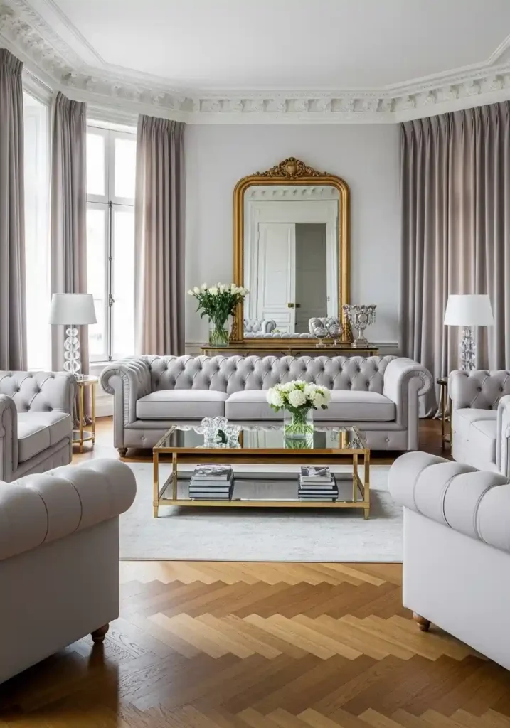 The most magnificently beautiful tufted sofa suite classy living rooms are those where the tufting quality is absolutely excellent and the fabric is genuinely the finest available — deep, consistent button placement in perfect diamond alignment across every tufted surface. The finest dove grey silk creating the most refined and the most broadly compatible result. Matching tufted bergère armchairs. A large polished brass and glass coffee table. Crystal table lamps. Warm herringbone parquet. Floor-to-ceiling pale grey silk curtains. An ornate gilt-framed mirror. Classical plaster cornice. Fresh white flowers. The comprehensive tufted suite creates extraordinary timeless elegance.
