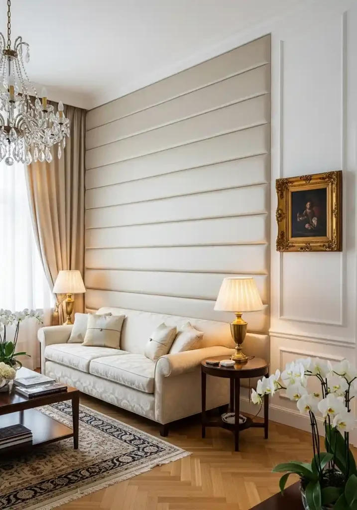 The most magnificently beautiful upholstered wall classy living rooms are those where the silk quality is genuinely excellent and the quilting precision is genuinely perfect — finest pale ivory silk with consistent diamond spacing throughout the complete wall surface. A large cream sofa positioned directly before the upholstered wall. Ivory and pale gold silk cushions. Warm brass table lamps. An elaborate crystal chandelier. Cream silk curtains. Warm herringbone parquet with antique silk rug. A significant gilt-framed artwork on the adjacent white wall. Fresh white orchids. The quilted silk upholstered wall creates extraordinary opulent timeless elegance.