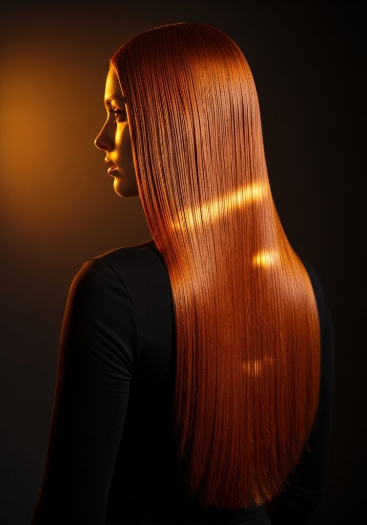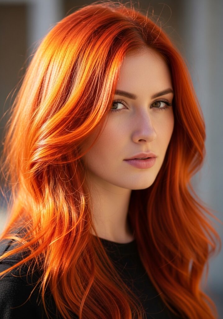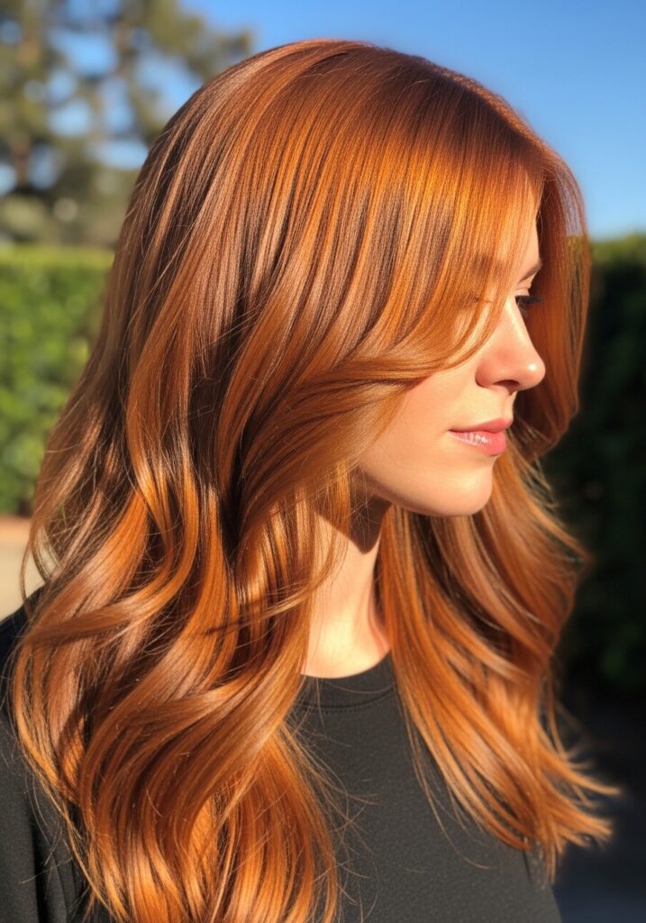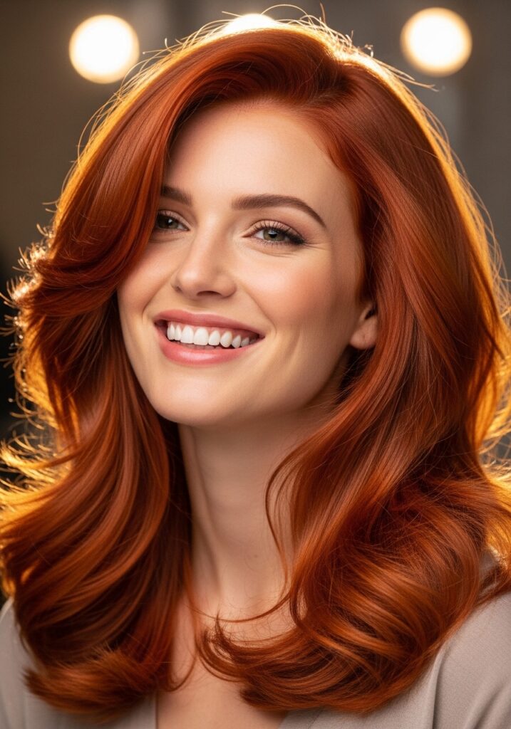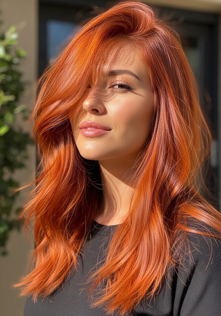 Copper red hair styled to a high-gloss, perfectly straight finish is one of the most dramatically commanding and visually spectacular hairstyle presentations available with this extraordinary color, using the extraordinary reflectivity of perfectly smoothed, flat-lying strands to amplify the metallic warmth of the copper red tones to their absolute maximum possible intensity and visual impact. When the copper red cuticle lies completely flat and every strand surface is as smooth and reflective as polished metal, the warm orange-red pigment appears to glow from within the hair with a richness and metallic depth that is genuinely breathtaking, transforming an already magnificent color into something that appears almost unreal in the concentrated intensity and genuinely precious quality of its warm, metallic radiance.