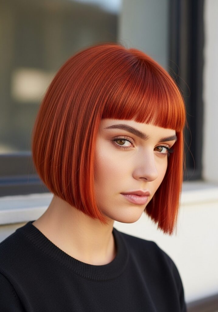 A copper red bob combines the architectural confidence and clean geometric elegance of the classic bob haircut with the warm, metallic brilliance of vivid copper red color to create a style of such complete, mutually enhancing aesthetic power that each element makes the other appear more dramatically and more genuinely beautiful than it would independently. The clean, defined lines of the bob give the copper red color a precisely contained frame that concentrates the metallic warmth of the color within a beautifully resolved geometric shape and makes the pigment appear even more richly saturated and intentionally vivid, while the copper red’s blazing warmth prevents the bob’s geometric precision from reading as cold or overly clinical. The two elements create a unified, powerful aesthetic statement.