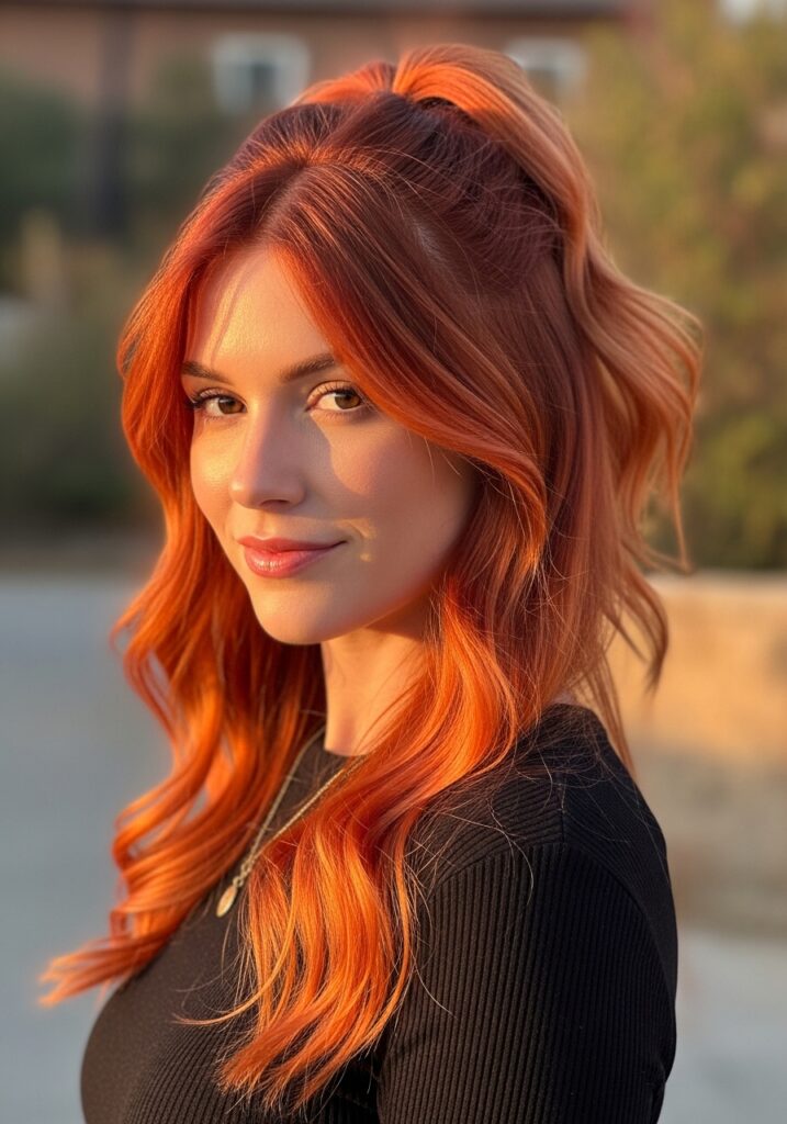 Copper red hair in a half-up half-down style creates one of the most effortlessly beautiful and warmly radiant everyday styling expressions available with this extraordinary color, combining the casual elegance of the partially gathered crown with the freely flowing, blazingly warm beauty of copper red lengths to produce a style that appears simultaneously casual and genuinely, warmly spectacular in its complete expression. The gathered top section concentrates the vivid copper warmth at the crown where it creates a beautifully intense focal point of metallic orange-red brilliance, while the flowing lengths below provide the romantic, abundantly warm backdrop that gives the gathered crown its sense of generous, beautifully framed warmth and genuine, relaxed elegance.
