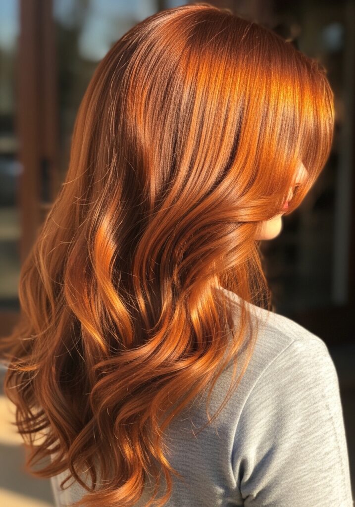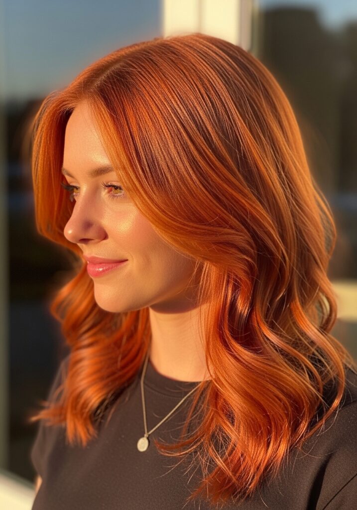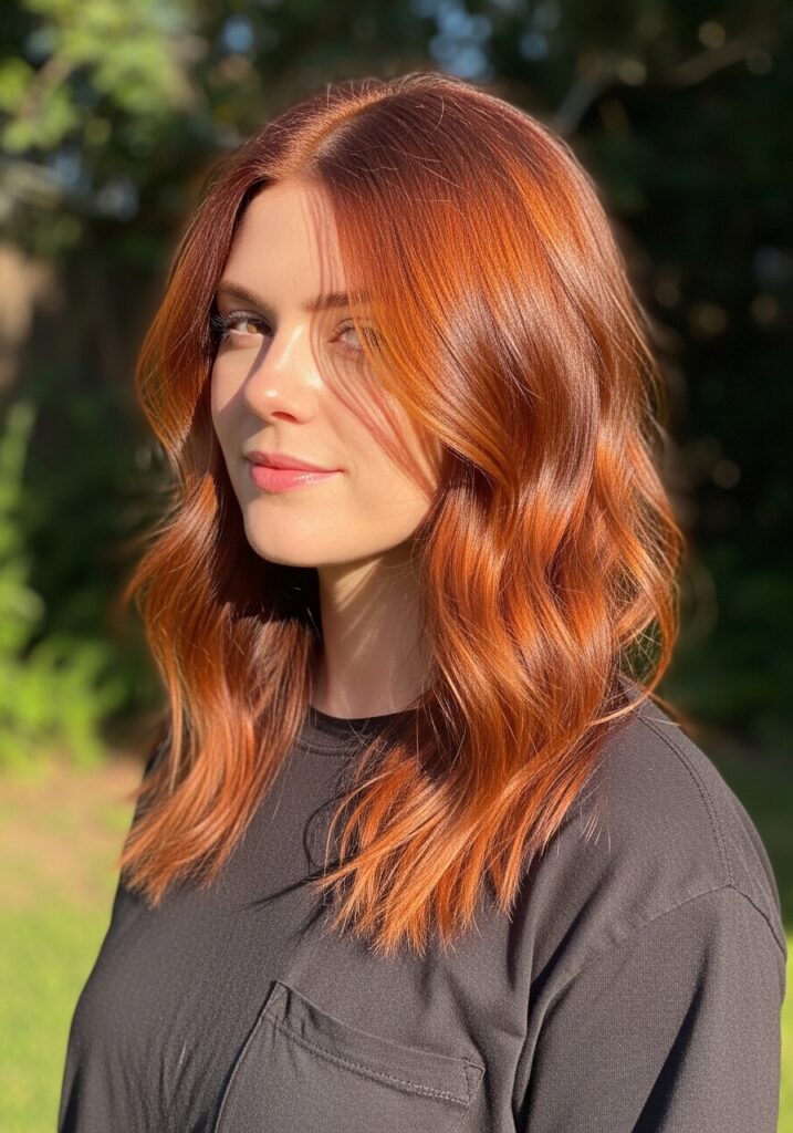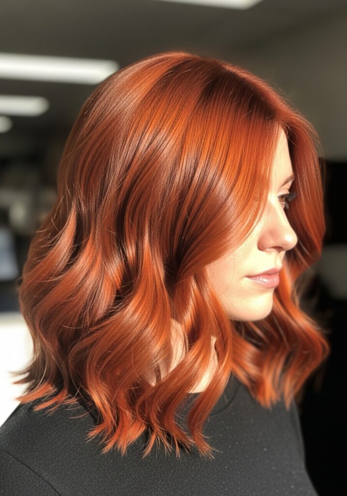 Copper red hair styled in romantic, flowing waves is perhaps the most visually spectacular and genuinely breathtaking way to experience this extraordinary color, because the organic movement of the wave texture transforms the copper red’s metallic warmth into something that appears almost alive and continuously animated in its shifting display of warm brilliance. The wave crests catch warm light and appear at their most intensely vivid and metallically bright, while the valleys between the waves deepen into richer, more burnished copper tones that provide a beautiful depth and shadow quality that gives the overall color an extraordinary three-dimensional richness. This constant, wave-generated interplay of lighter and deeper copper tones creates a color experience of genuinely hypnotic, beautiful complexity.