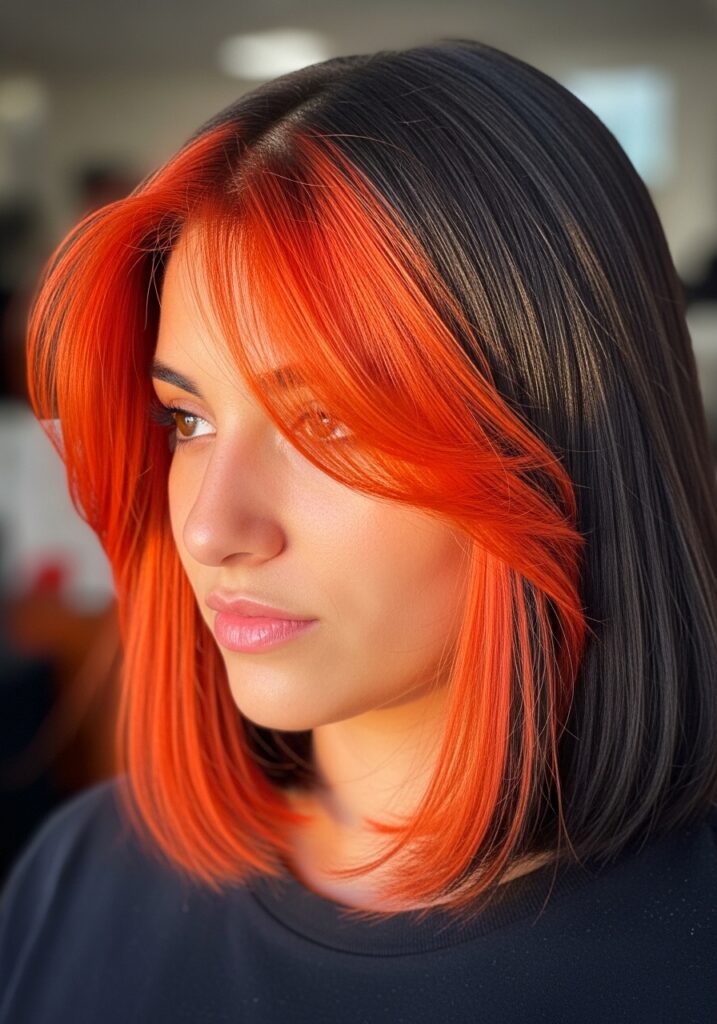 Copper red with deliberately maintained dark roots is one of the most stylistically sophisticated and practically intelligent approaches to wearing this vivid color, creating a deliberate two-toned effect that allows the blazing warmth of the copper red lengths to appear even more dramatically vivid and brilliantly metallic by contrast with the deep, grounding darkness of the intentionally preserved root area. The dark root shadow prevents the extreme warmth of full copper red from root to tip from creating any overwhelming or potentially washing-out quality against lighter skin tones, instead providing a beautiful, grounding depth at the crown that makes the overall color appear more dimensional, more intentionally designed, and more genuinely sophisticated than uniform copper red throughout.