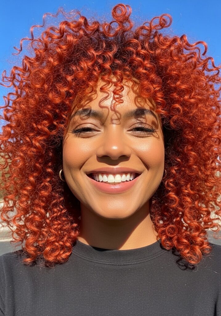 Copper red on naturally curly hair creates one of the most genuinely magnificent and visually spectacular color results available in all of hair coloring, because the curl pattern generates an infinite variety of light-reflecting surfaces within the metallic copper red color that produce a dimensional warmth and tonal complexity of such extraordinary, continuously shifting beauty that it appears almost otherworldly in the intensity and completeness of its blazing, warm radiance. Each individual curl coil catches light at its own specific angle and position within the overall curl pattern, with the most directly lit sections of each coil appearing at their most brilliantly metallic copper while the shadowed interior sections of each curl deepen into a richer, more burnished orange-red that creates extraordinary natural depth. The result is genuinely breathtaking.