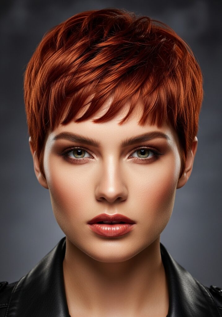 A copper red pixie cut creates one of the most powerfully beautiful and genuinely show-stopping color and cut combinations available in contemporary hair styling, concentrating every strand of the vivid, metallic orange-red copper color into the most compact and visually dense possible silhouette to create an almost incandescent warmth around the entire head that makes the wearer appear to be lit from within by a warm, glowing copper light source that radiates directly onto the features from every direction simultaneously. The shortness of the pixie means that every strand of copper color is fully, completely visible and contributing to the overall metallic warmth and radiance of the style without any length to distribute or dilute the color’s intense, concentrated impact.