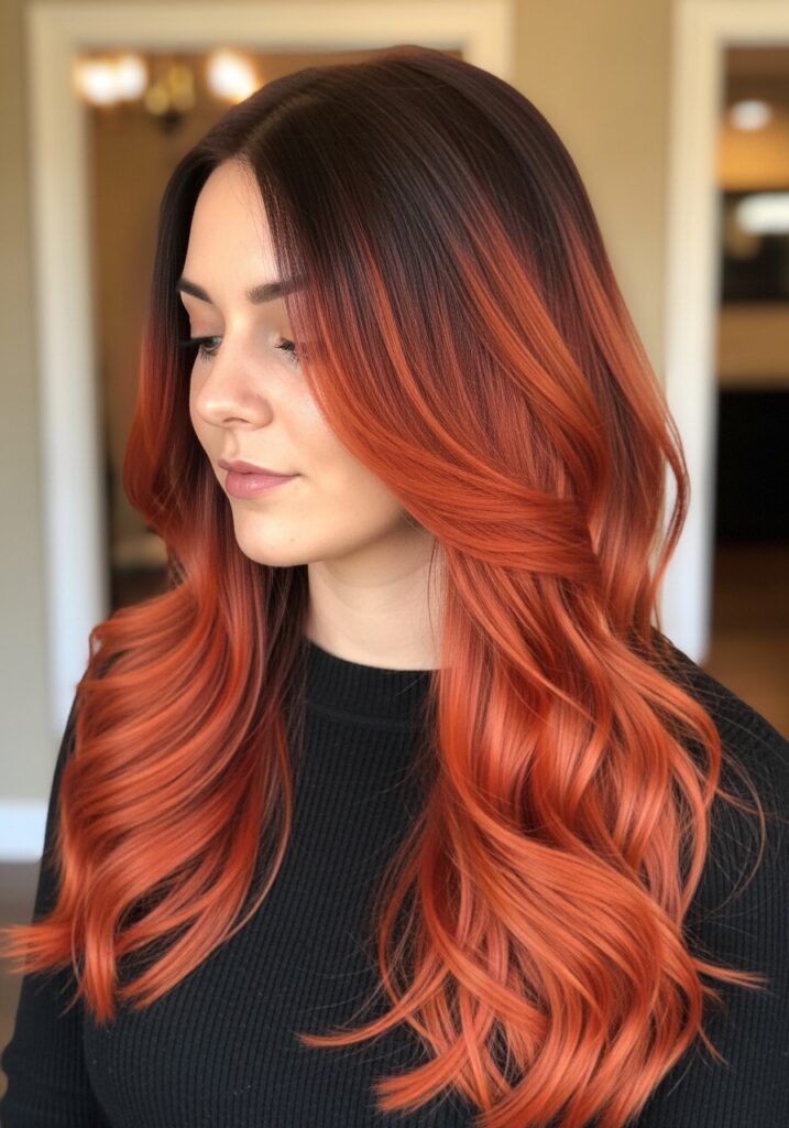 Copper red balayage on dark hair is one of the most dramatically beautiful and genuinely spectacular color techniques available within the copper red family, using the freehand balayage painting method to introduce warm, metallic copper tones into a deeper dark base in a way that creates a gradient of fiery warmth that appears to emerge organically from within the dark base rather than being externally applied. The dark base provides an extraordinary contrast backdrop against which the copper red balayage blazes with maximum metallic brilliance, because the strong tonal differential between the deep, cool darkness of the brunette base and the intensely warm, metallic orange-red of the copper highlights creates a dimensional color relationship of extraordinary visual power and genuine, breathtaking beauty that single-process copper red on lighter bases cannot replicate with the same dramatic contrast and fiery impact.