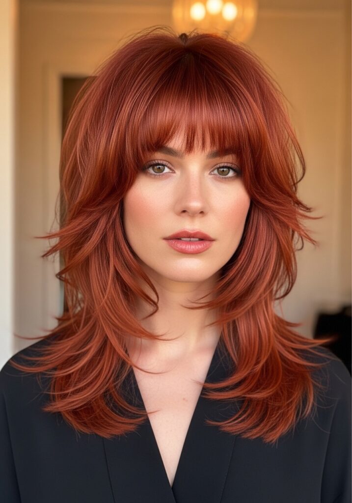 The curtain bangs of the copper red shag are particularly beautiful because the metallic warmth of the copper red in the face-adjacent bang sections creates an immediate, intensely warm illumination of the features from the most intimate, closest possible distance, making the eyes appear more vividly expressive and the complexion appear more beautifully glowing and warmly radiant than any other color at any other bang position could create with equivalent face-level warmth and intensity. Women who choose the copper red shag consistently describe it as the most dramatically beautiful and most continuously admired version of this color they have ever worn, because the shag’s textural complexity gives the copper red color its most complete, most dimensionally spectacular natural showcase.