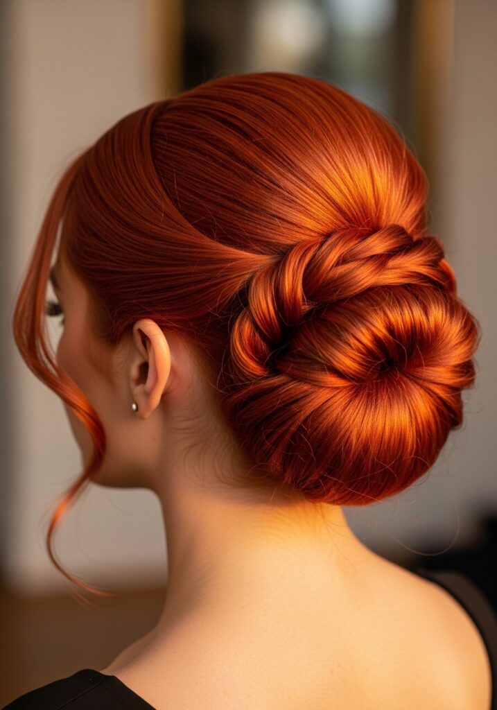 Copper red hair in an elegant updo creates one of the most warmly spectacular and genuinely show-stopping formal hairstyle presentations available, concentrating the vivid metallic warmth of the copper color into a gathered arrangement at the crown and nape that creates a fiery, glowing focal point of warm, metallic beauty that catches formal event lighting with a brilliance and warmth that no other hair color in any gathered style can quite replicate with the same quality of intense, warm luminosity. When the copper red is gathered and twisted into a chignon, low bun, or elaborate updo, the concentration of the metallic orange-red tones at the gathered sections creates a warmly glowing, almost incandescent quality in the formal style that makes the wearer appear to be lit from above by warm, copper-colored light.