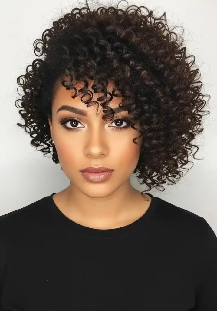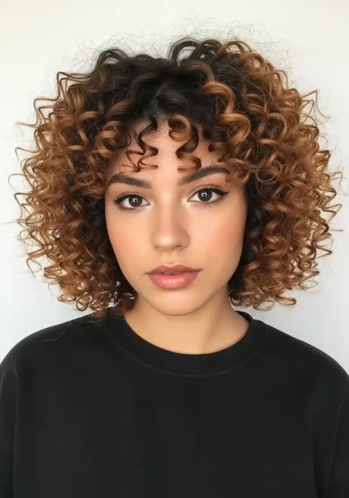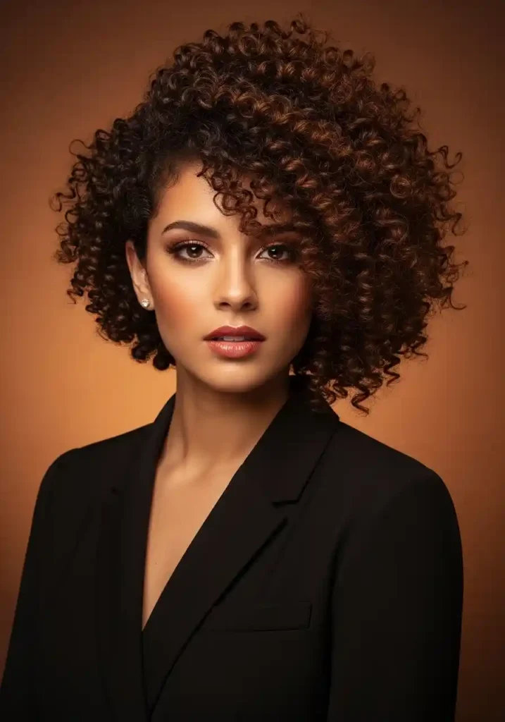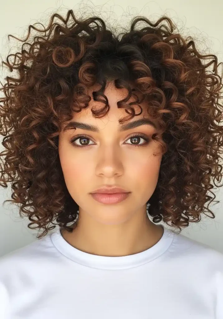 A curly bob with color-treated curls — specifically warm balayage or highlights applied through the curly structure — creates a hair color and cut combination of extraordinary dimensional beauty because the curl pattern displays color dimension in a completely unique way from straight hair. Each spiral’s curved surface catches light at different angles depending on the curl’s rotation, creating a constantly shifting display of the lighter color against the darker base as the curls move. This creates a color-in-motion quality that is unique to curly hair and uniquely beautiful.