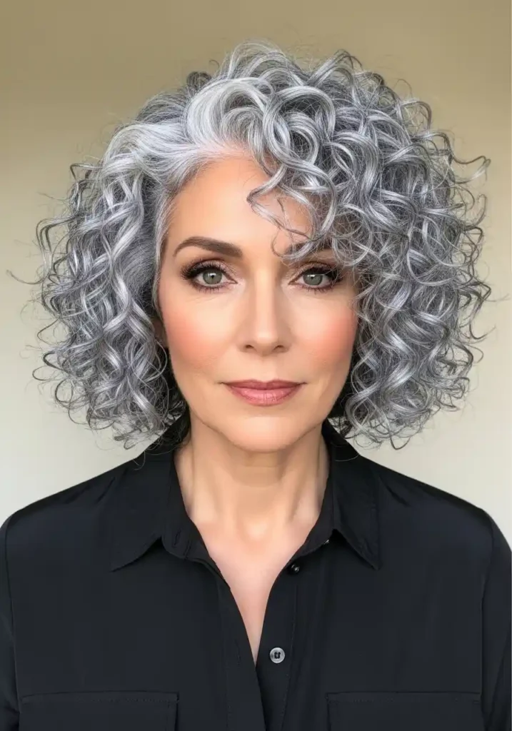 A natural gray curly bob is one of the most genuinely powerful and most specifically beautiful expressions of the curly bob concept — the silver and gray tones of naturally going gray curly hair create a shimmer and luminosity within the curl pattern that colored hair cannot approach, with each individual curl catching and reflecting light with an almost metallic, iridescent quality that makes the gray curly bob genuinely extraordinary in any lighting condition. Gray curly hair in a bob shape communicates complete confidence in both the natural texture and the natural color simultaneously.