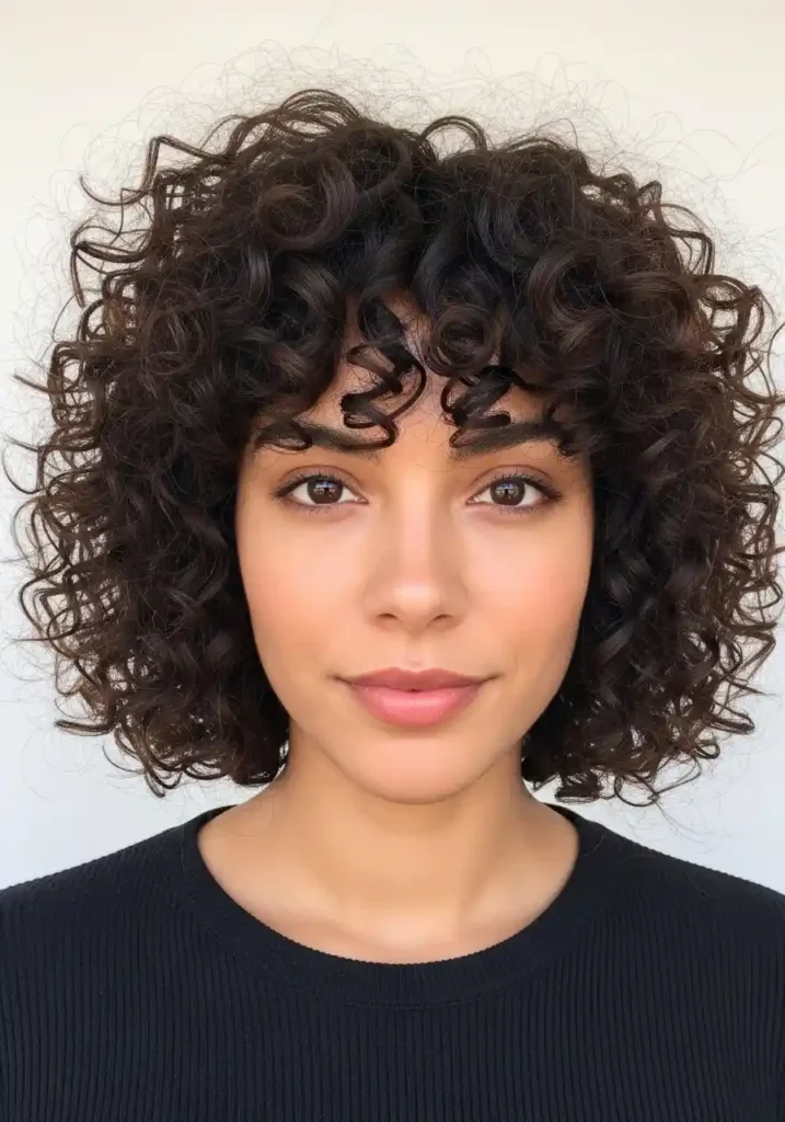 A curly bob with a natural curly fringe creates one of the most uniquely charming and genuinely original hairstyle expressions available in curly hair cutting, using the natural curl pattern of the fringe sections to create a face-framing element of completely organic, three-dimensional beauty that no straight fringe can replicate with the same authentic, individual character. The curls in the fringe section spiral and coil in their own natural directions, creating a fringe that is beautifully imperfect in its organic expression while remaining completely flattering and face-framing in its overall effect, with each individual curl coil contributing its own springy personality to the complete fringe composition.