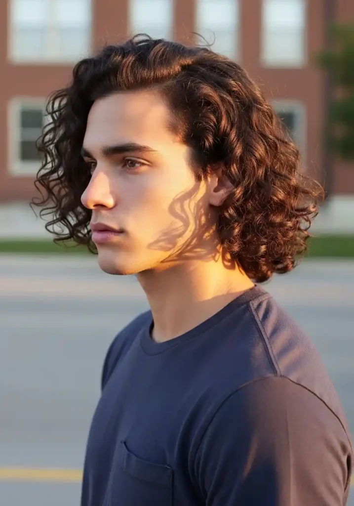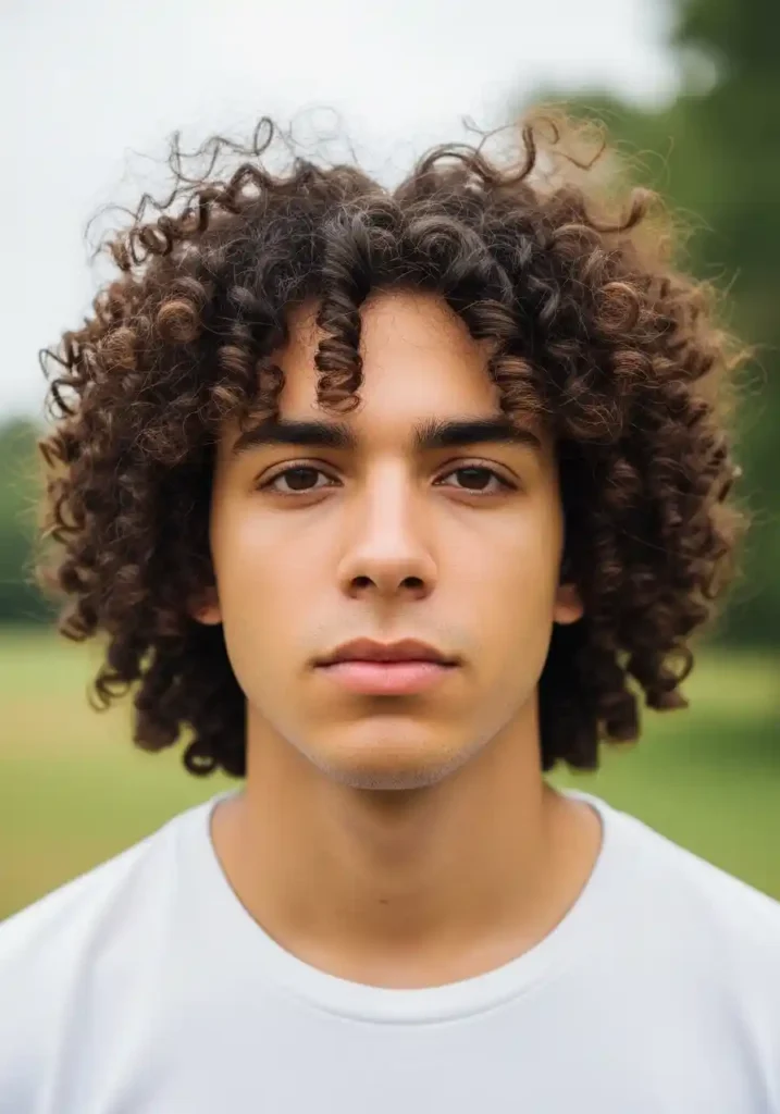 Long curly hair shaped to a clean, rounded overall form creates the most freely expressive and most naturally flowing longer curly men’s hairstyle available — the longer length allows the full natural curl character to express itself most abundantly and most specifically, while a professional shaping that removes the split-end weight and creates a clean rounded exterior silhouette gives the abundant long curls a quality of intentional, specifically defined form rather than simple uncut length.