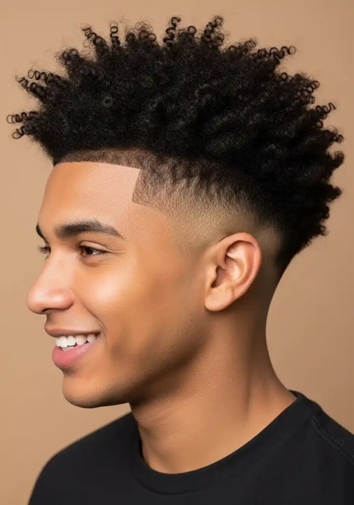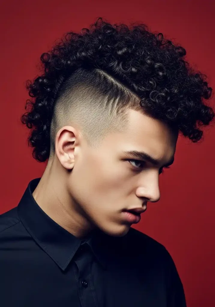 The curly mohawk works most beautifully when the curls are allowed to express their full natural volume and definition rather than being flattened or uniformed by heavy products — apply a curl cream to the center section while the sides are closely maintained, encouraging the natural curls to lift and define in their most expressive natural direction. The contrast between the natural curl’s abundant volume at the center and the close-cut sides creates the mohawk’s characteristic dramatic visual impact. A fade refresh every two weeks maintains the clean contrast.