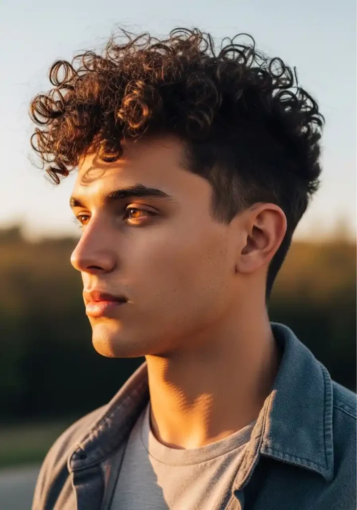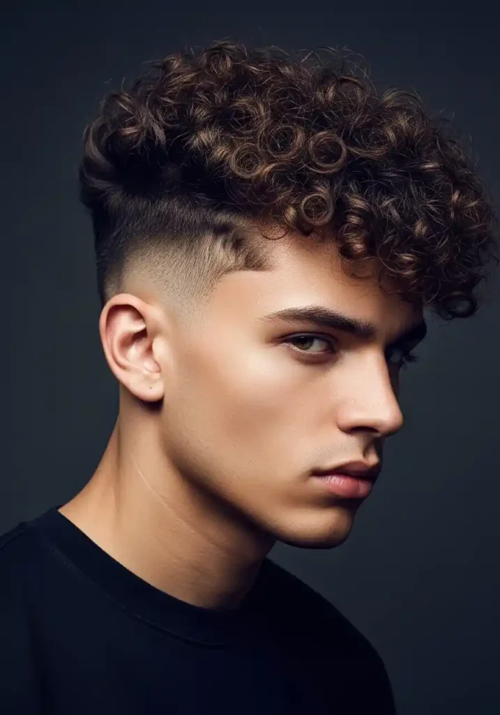 A curly mohawk creates the most boldly defined and most powerfully striking curly men’s hairstyle statement available — the natural curls concentrated along the center line of the head and encouraged to lift upward in their natural formation, combined with tightly faded or closely cut sides, creates a hairstyle of extraordinary visual impact and complete aesthetic conviction. The curly mohawk celebrates the natural curl’s inherent volume and definition as the primary design element of a maximally bold hairstyle statement.