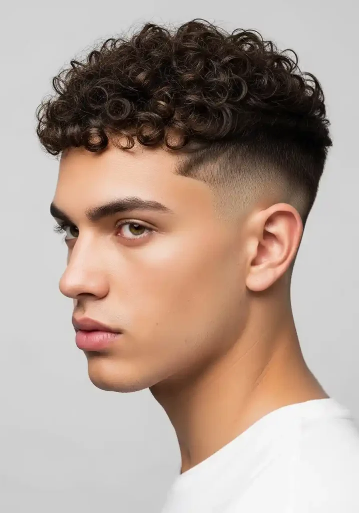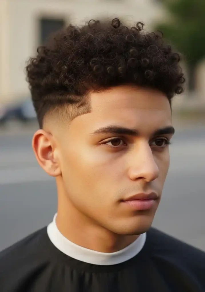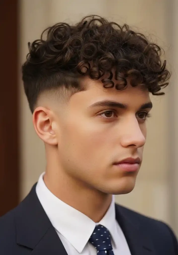 The fade specifically creates the clean quality that makes curly hair appear defined rather than messy — the graduated transition from skin to longer curl at the top creates a clear visual distinction between the maintained sides and the natural curl expression above that reads as specifically intentional and specifically attractive. A professional fade touch-up every two to three weeks maintains the architectural precision. Style the curls by applying a lightweight curl cream to damp sections and diffusing on low heat for the most naturally clean and most specifically beautiful defined result.