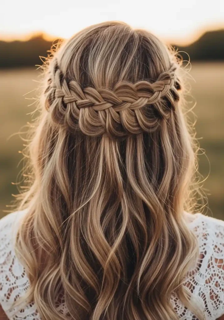 The crown braid works most beautifully when it is executed with a looser, more organic tension rather than a tight, pulled-down technique — loose braiding allows the individual sections to show their volume and color variation, creating a braid that looks full, warm, and three-dimensional rather than flat and tightly woven. Accessorize with small dried florals, delicate gold pins, or small pearl pins woven through specific sections of the braid for additional detail that complements the warm dirty blonde tones without overwhelming the color’s natural beauty. This is a hairstyle for weddings, outdoor events, and any occasion that calls for genuine romantic beauty.