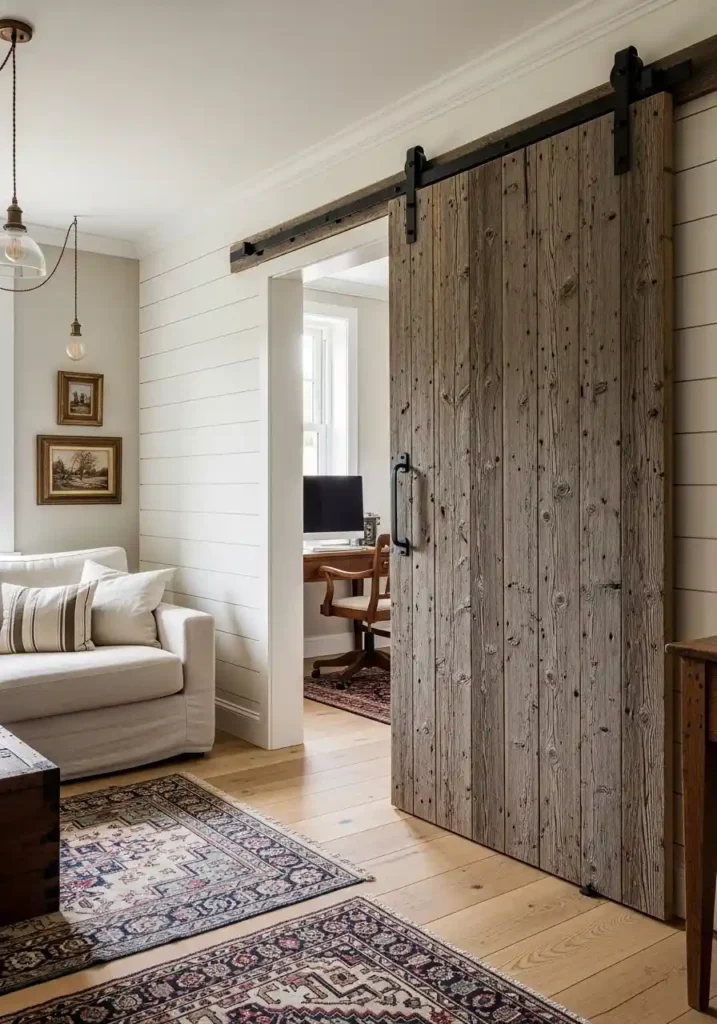 8. The Barn Door Living Room Feature: Industrial Rustic Hardware as Design Statement