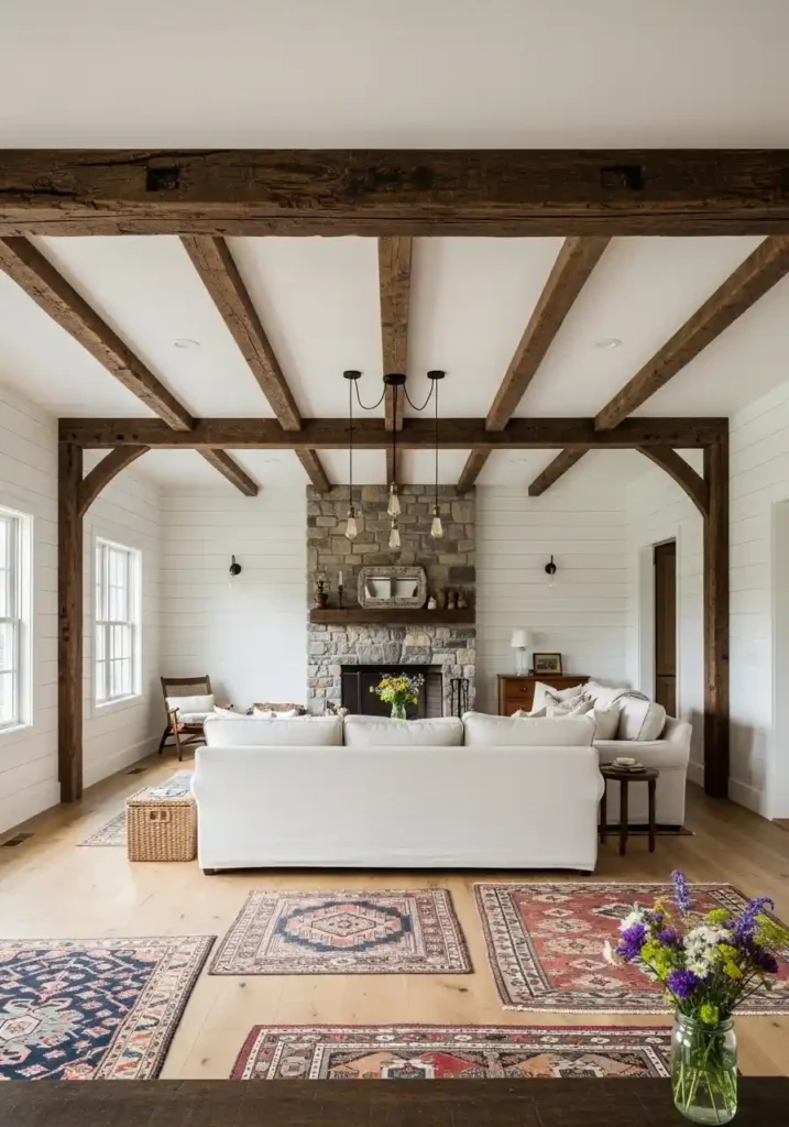 The most magnificently beautiful exposed ceiling beam farmhouse living rooms are those where the beams are of genuinely substantial dimensions — at minimum 20cm depth creating real architectural presence! Visible aged surface character communicating genuine history. Warm Edison bulb pendant lights hung from the center beam. White shiplap walls below creating maximum beautiful contrast. Warm wide plank oak floors. A large cream linen sectional sofa. Layered vintage rugs in warm earthy tones. A stone fireplace. Fresh wildflowers in a Mason jar. The exposed ceiling beams create extraordinary rustic farmhouse architectural magnificence from above.