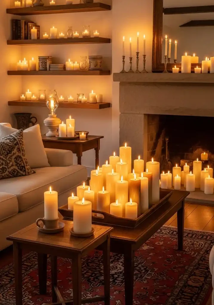 The most magnificently atmospheric farmhouse candlelight living rooms are those where the candle collection is genuinely generous and genuinely varied — cream and natural beeswax pillar candles in graduated heights on the coffee table tray. Tall taper candles in vintage tin candlestick holders on the fireplace mantel. Small votive candles in clear glass on floating shelves. Matching pillar candles on end tables. All burning simultaneously. A warm Edison bulb lamp supplementing the candlelight. Cream sofa. Warm plank floors. Vintage rugs. Stone fireplace. The comprehensive candlelight creates extraordinary rustic atmospheric farmhouse warmth.