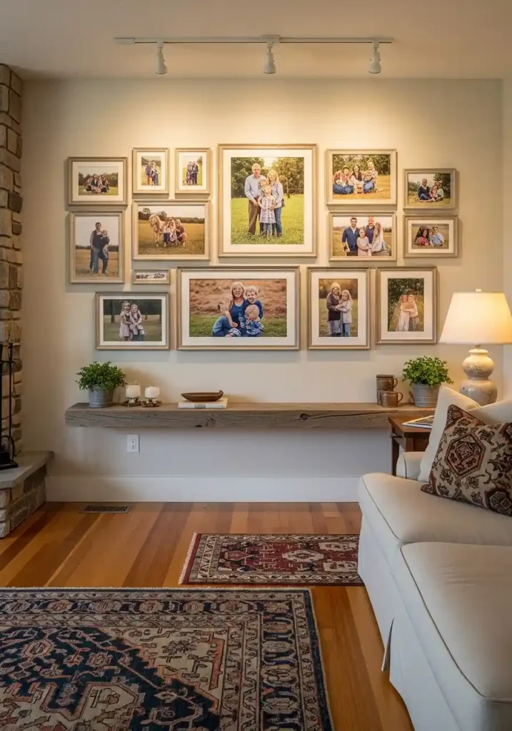 The most magnificently personal farmhouse gallery walls are those where the photographs are genuinely meaningful and genuinely varied — outdoor family moments in natural light. Harvest celebration photographs. Children with farm animals. Multi-generational family gatherings. Each genuine photograph contributing to a gallery of such extraordinary personal warmth and real family story that it makes every gathering in the farmhouse living room feel more warmly celebrated and more specifically beloved! Simple distressed wooden frames in consistent warm tones. Warm directional gallery lighting. A reclaimed wood floating shelf below. The family gallery creates extraordinary personal farmhouse warmth.