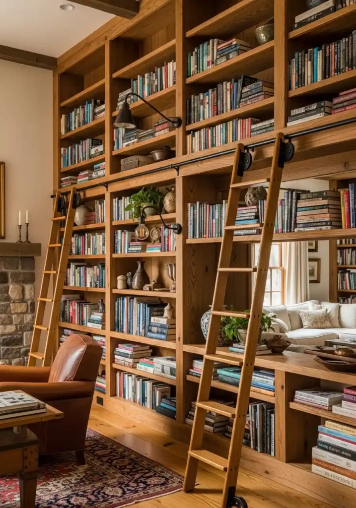 The most magnificently beautiful farmhouse library living rooms are those where the bookshelves are of genuine pine construction with warm natural grain visible — simple honest construction communicating farmhouse directness rather than elaborate furniture complexity! A rolling library ladder in warm pine on black iron rails creating the most theatrically dramatic and the most practically beautiful upper shelf access. Vintage ceramics and plants between book stacks. A deep leather armchair at reading distance. Warm Edison bulb lamp. Warm wide plank floors. Vintage Persian rug. Cream sofa. Stone fireplace. The farmhouse library creates extraordinary rustic intellectual charm.